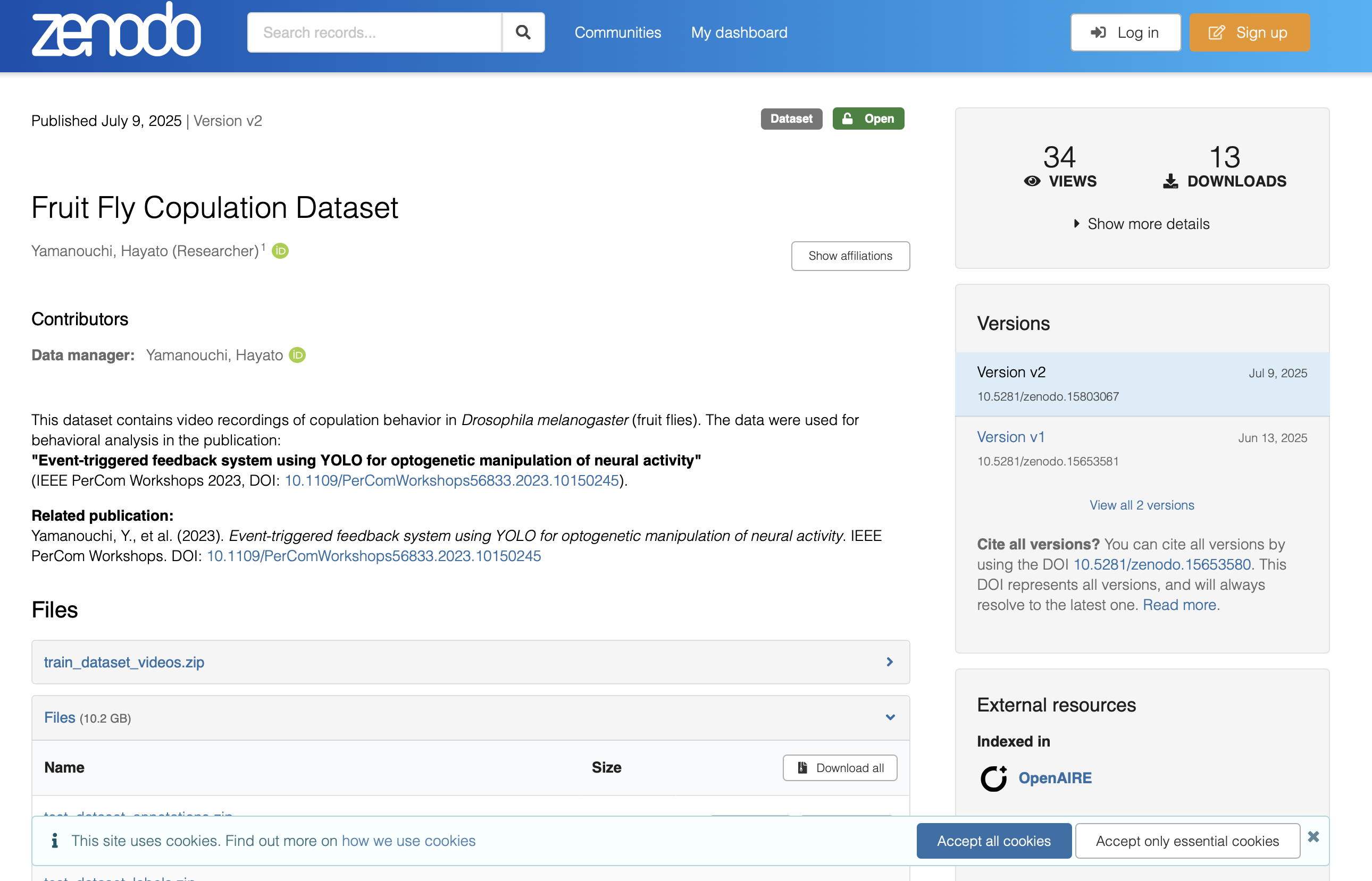 Citation Yamanouchi, H. (2025). Fruit Fly Copulation Dataset [Data set]. Zenodo. https://doi.org/10.5281/zenodo.15803067
